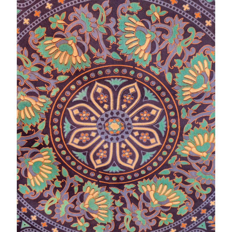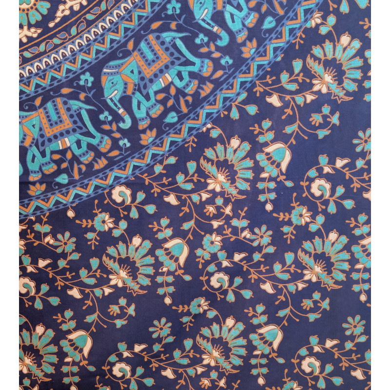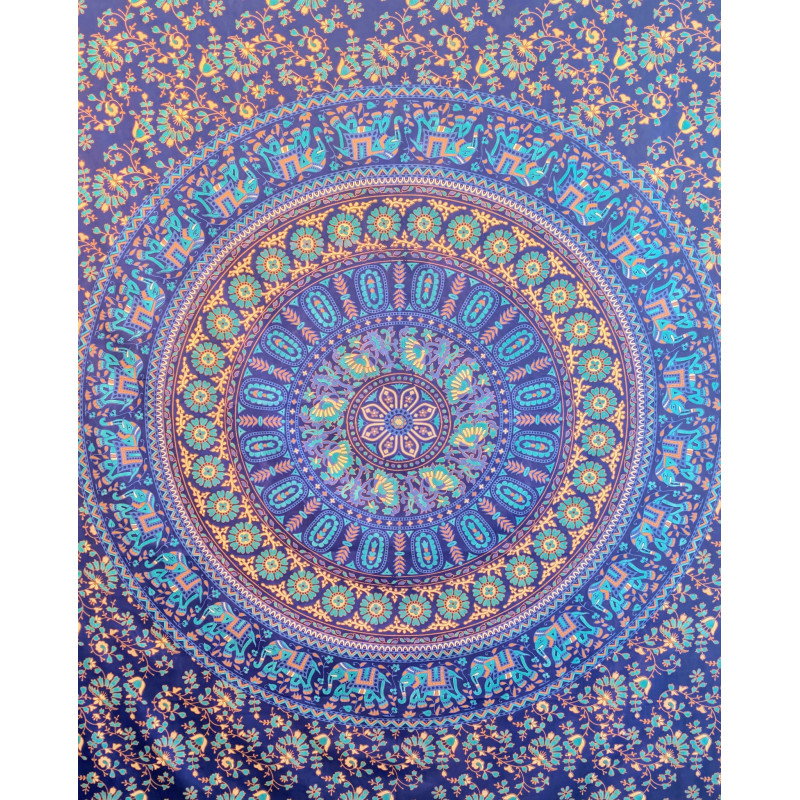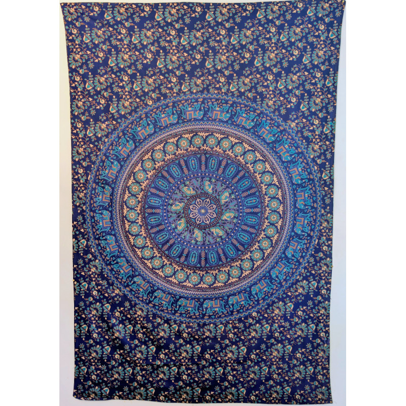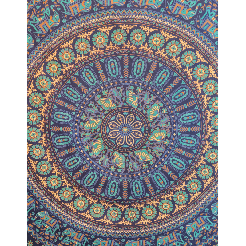 Tenture murale indienne mandala éléphants en coton bleu marine, bleu turquoise et beige - 140 x 200 cm