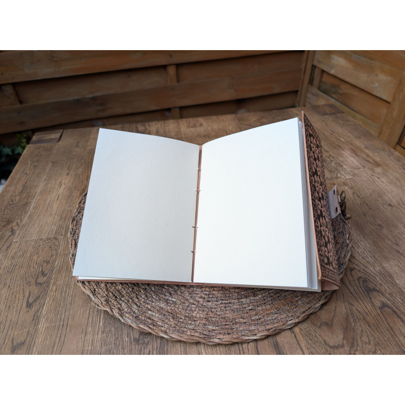 Ce carnet en cuir naturel s’adapte à de nombreux usages. Il peut devenir un carnet de voyage, un carnet à croquis, un cahier d’écriture, un journal intime, un livre de recettes, un livre d’or ou un recueil de poèmes. Grâce à la qualité de son papier, il convient aussi aux techniques créatives comme la gouache, l’aquarelle, les encres ou le Posca, sans onduler ni se transpercer. Son esthétique forte et son décor symbolique en font également un très beau grimoire de magie, un carnet secret ou un support personnel pour consigner idées, rêves et inspirations.
