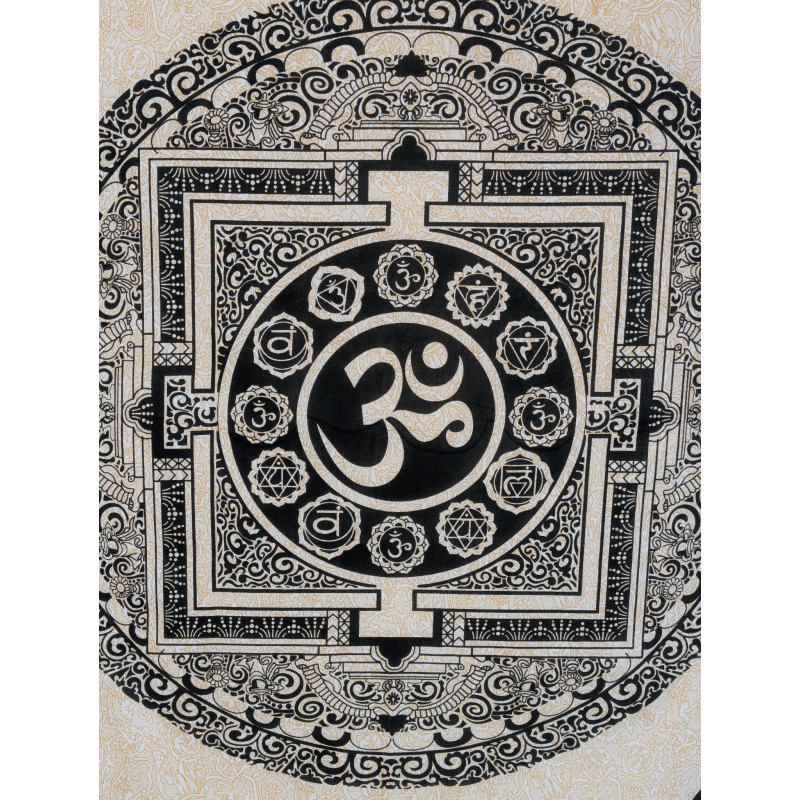 Dans la culture indienne, Om est un symbole sacré très connu, souvent associé à l’unité, à l’énergie vitale et à l’harmonie intérieure. Il évoque la vibration originelle et la connexion entre le corps, l’esprit et l’univers. Les motifs circulaires et symboles qui l’entourent rappellent l’univers des chakras et du yantra, liés à l’équilibre, à la méditation et à la concentration. Sur une tenture, cet ensemble crée une décoration à la fois esthétique, spirituelle et profondément inspirée de la tradition indienne.
