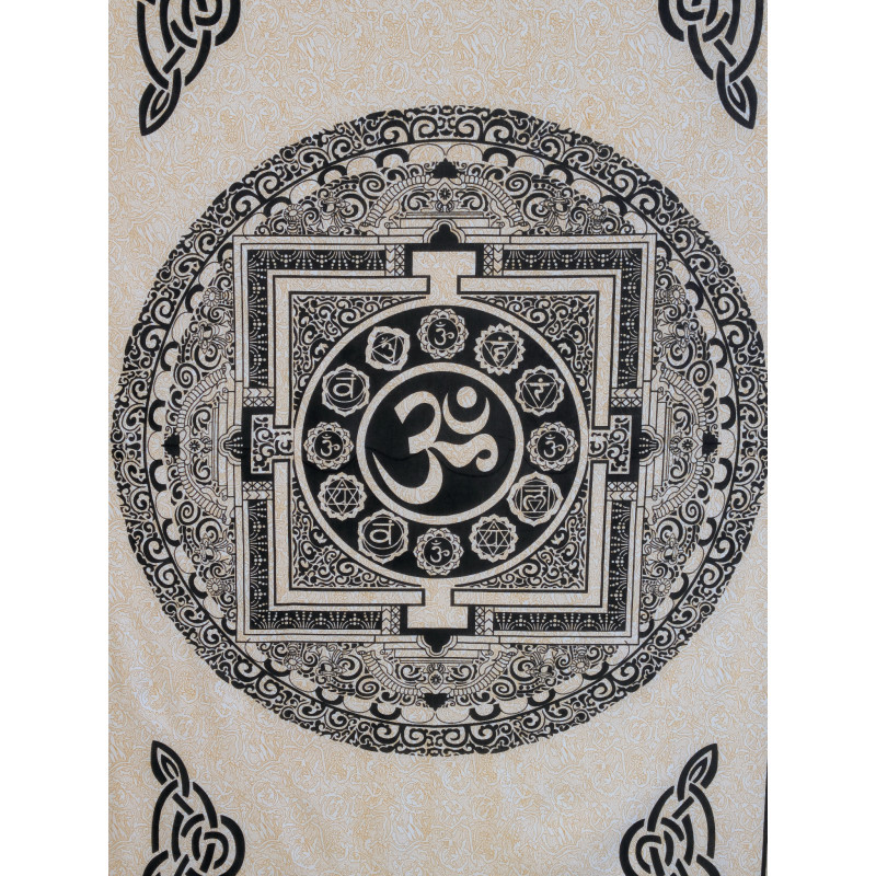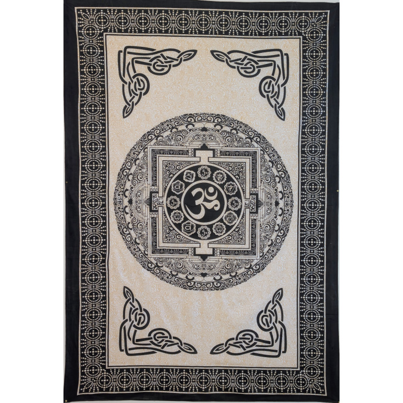 Cette tenture ne reprend pas un mandala classique, mais un décor inspiré de la symbolique indienne, avec un grand Om central entouré de motifs circulaires, géométriques et ornementaux qui évoquent l’univers des chakras et du yantra. Les bordures travaillées et les entrelacs apportent une touche graphique élégante, parfaite pour une décoration murale ethnique, zen ou spirituelle. Son design attire l’œil sans surcharger la pièce et s’accorde facilement avec des matières naturelles, du bois, du rotin ou des textiles unis.
