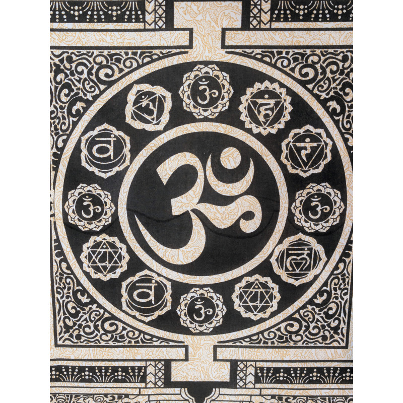 Tenture murale indienne Om noire et beige en coton - 140 x 200 cm