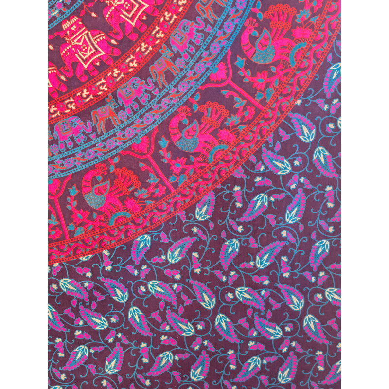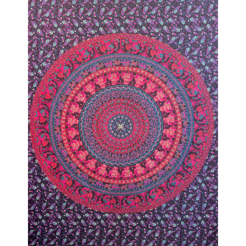 Tenture murale indienne mandala éléphants et paons en coton noir, rose fuchsia et bleu turquoise - 140 x 200 cm