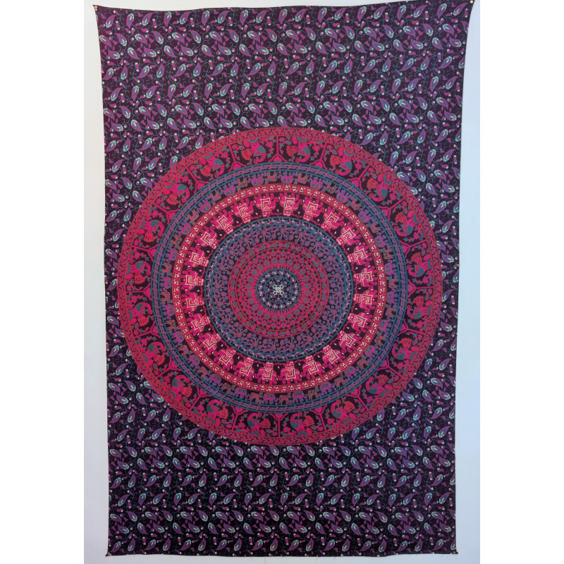 Apportez du caractère à votre intérieur avec cette tenture murale indienne en coton au superbe mandala central, entouré de motifs d’éléphants et de paons. Son alliance de noir profond, rose fuchsia et bleu turquoise crée une décoration bohème, ethnique et lumineuse.