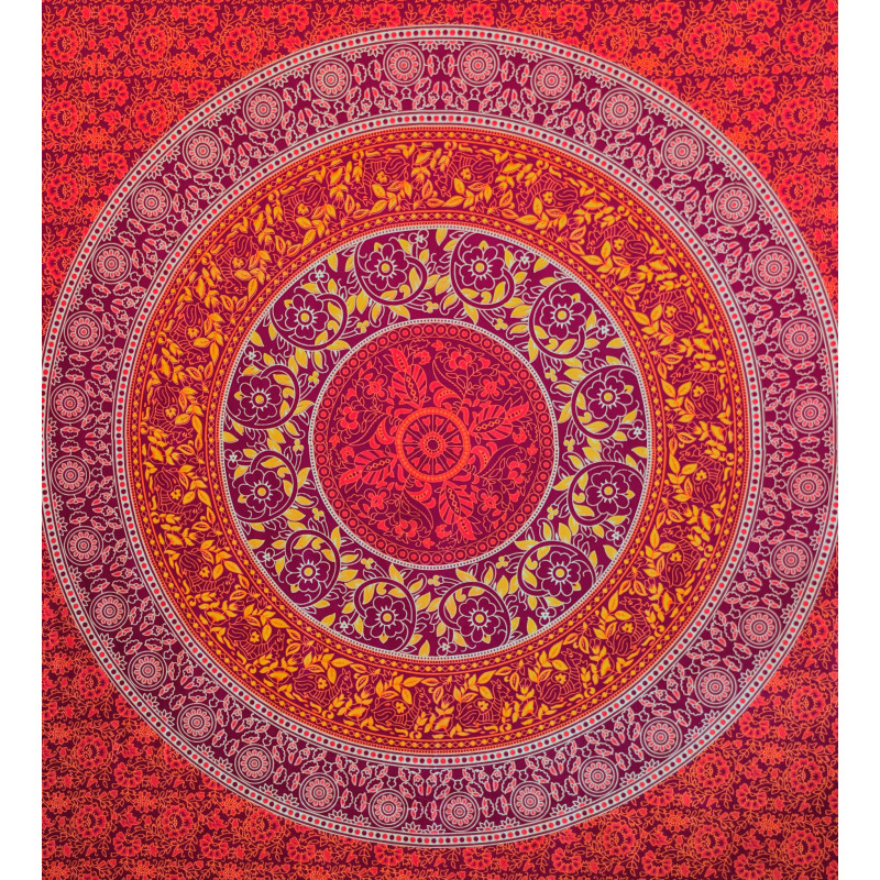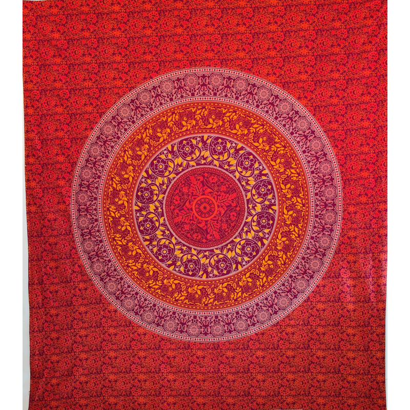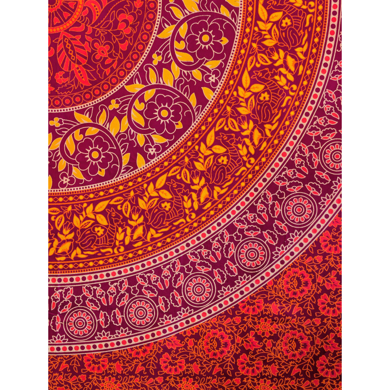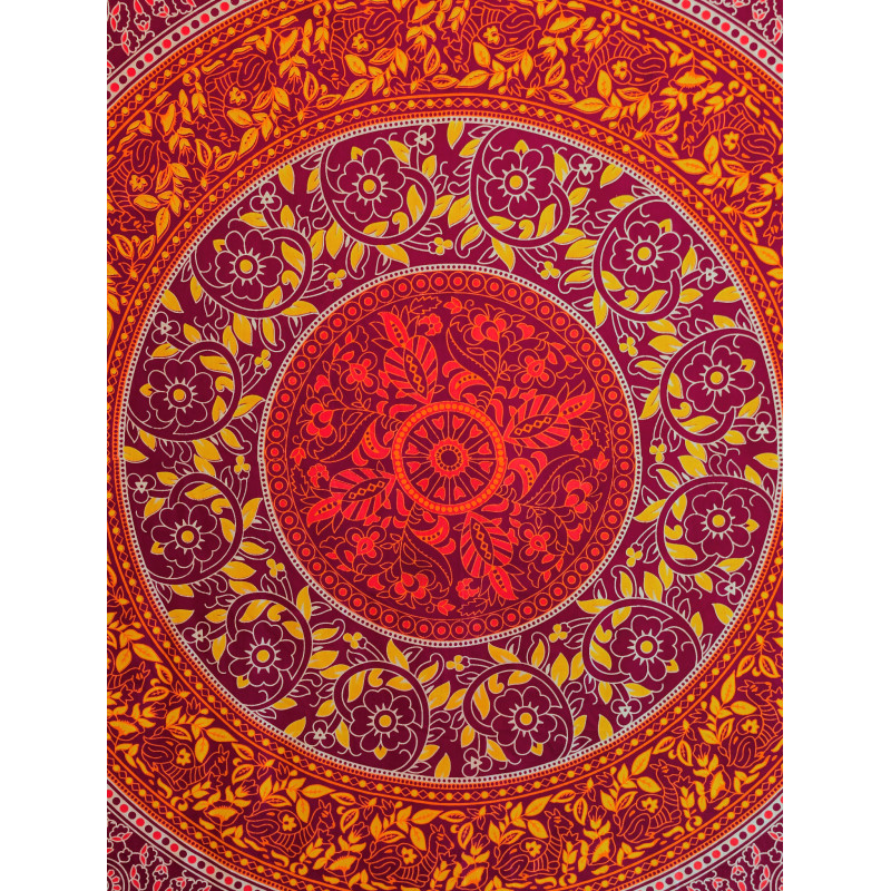 Cette tenture murale indienne en coton séduit immédiatement par la richesse de son décor circulaire et par son élégante palette de couleurs. Son grand mandala floral, composé de courbes harmonieuses, de rosaces et de motifs inspirés du cachemire indien, attire le regard et donne du caractère à la pièce. Les nuances de orange éclatant, de violet prune, de rose intense et de jaune doré créent un ensemble lumineux, parfait pour une décoration bohème, ethnique ou orientale.