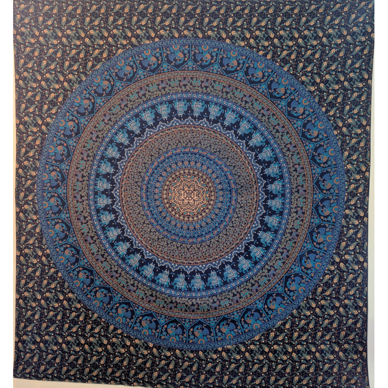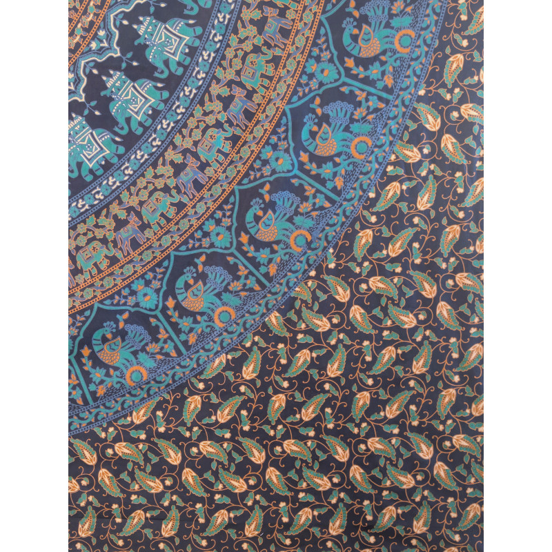 Tenture murale indienne mandala éléphants et paons en coton bleu marine, bleu turquoise et beige - 200 x 240 cm