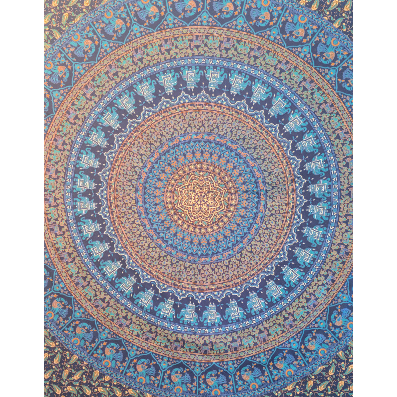 Apportez de la profondeur à votre décoration avec cette tenture murale indienne en coton au superbe mandala central, sublimé par des éléphants, des paons et de riches détails floraux. Son harmonie de bleu marine, bleu turquoise et beige crée une ambiance apaisante, élégante et dépaysante.